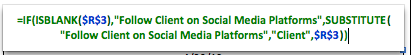The formula here is a combination of static text and a SUBSTITUTE formula to populate the client name by simply pulling from the input field. Adjusting the =IF(ISBLANK()) to make sure that our generic content remains even before the input field is completed and we're left with the following: