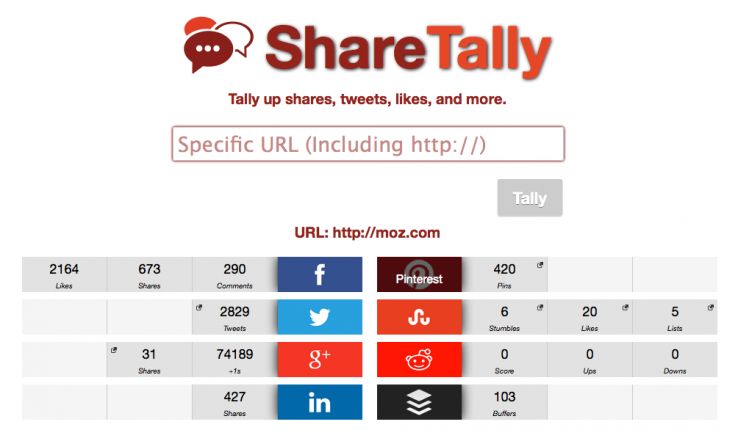 ShareTally – Similar in function to SharedCount, ShareTally gives you a free and quick overview of important social metrics for any URL. This is one you bookmark.