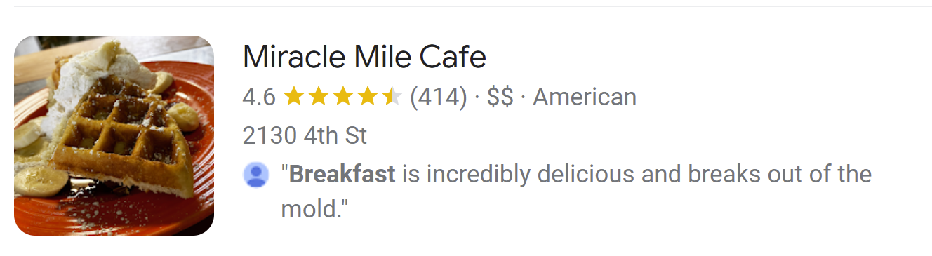 Now that you’ve filled out the name field of the business you’re marketing and its top competitor, evaluate how the actual words in the name could be impacting rankings. Google has historically given a ranking boost to businesses with names containing keywords. For example, if our search phrase was “Breakfast San Rafael”, then a business named “Delish Breakfast” or “Good Morning San Rafael” might have some advantage over one named “Joe’s Place”.