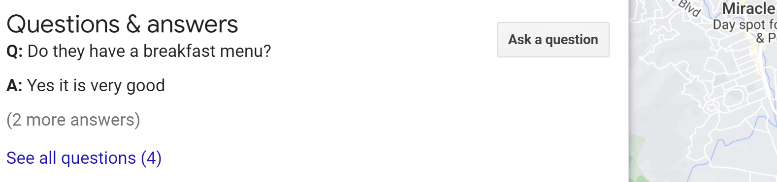 Record the number of questions each business has received. In our screenshot, the business has received four total questions. Mark a “win” for the business with the most questions, because their audience is the most engaged with this feature.