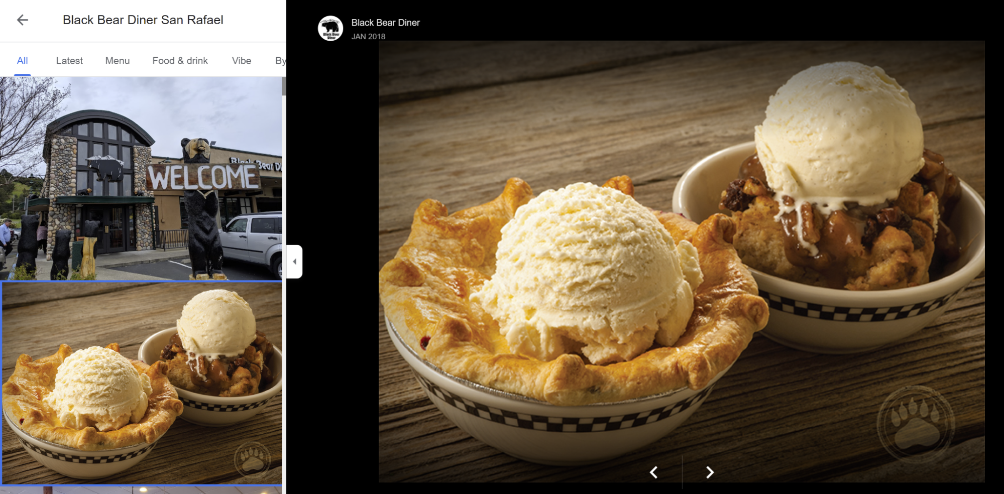 Fill out rows 27 and 28 in your spreadsheet by counting the number of photos each business has, calculating the percentage of them that have been uploaded by the owner (see the identity of the uploader in the upper left of the larger dessert photo), and make a judgment of the overall quality of the photo set. For example, has your business or the competitor uploaded images more recently, and are those images of high quality? These are your basic checks.