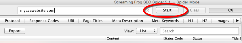 First things first: paste or type in your website URL into the field at the top, then click "Start" to let the crawler do its job.
