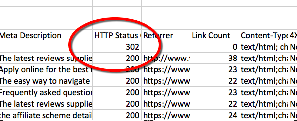 In Excel, sort your results by "HTTP Status" to find those pesky pages throwing up nasty 500s, unexpected 404s and forgotten 302s.