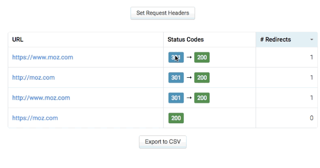OK, right on moz.com!! 301s all pointing to the same location. Now that you know what we’re looking for, let’s see what happens when good sites go bad…