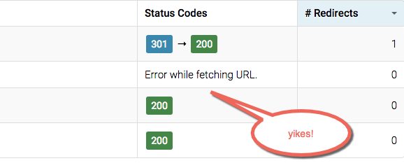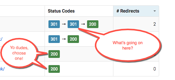 Below we see a redirect chain and a canonicalization error. This is something you might not see in a browser, but when you're dressed up like a bot it’s uncovered.