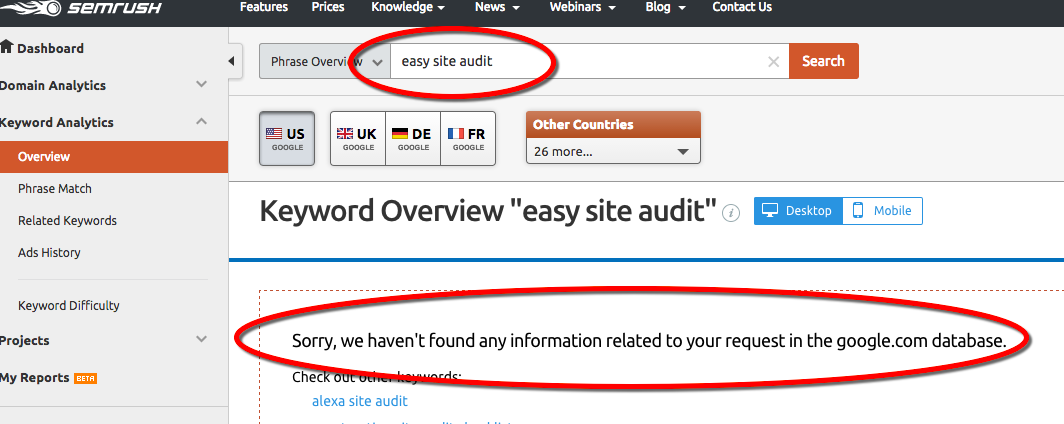 For the term "easy site audit" above, we’re not getting any results. That’s OK — you can go back to manual searches.