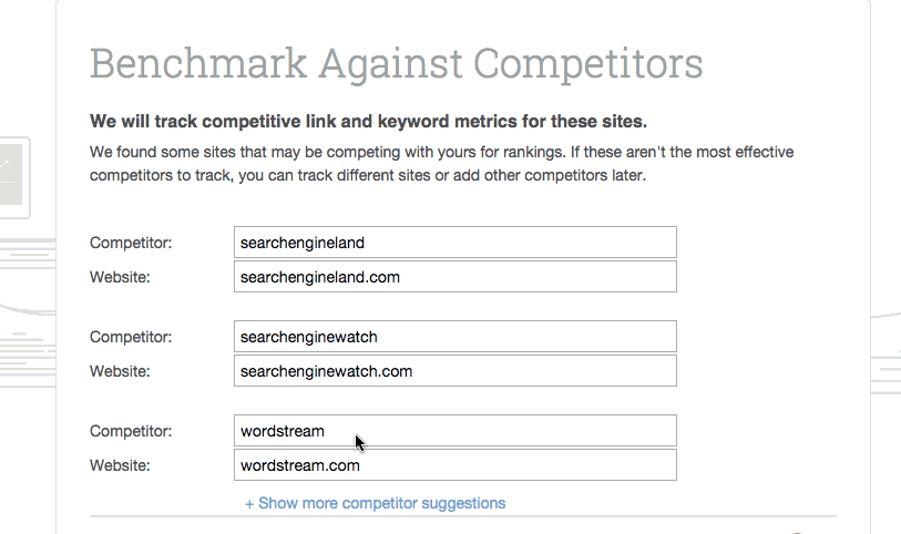Moz Pro automatically suggest 3 competitors, but with the research you’ve performed you’ll now have a good idea of who else you want to stalk — err, I mean track.