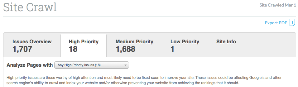 It finds all the things that need attention on your site and dishes them out to you neatly prioritized by High, Medium, and Low.