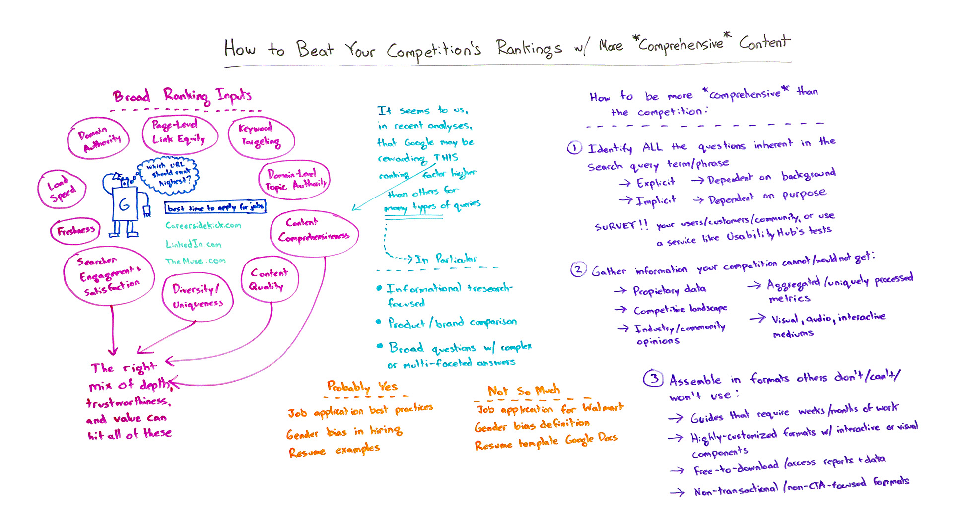 Howdy, Moz fans, and welcome to another edition of Whiteboard Friday. This week we're going to chat about, well, something I've noticed, something we've noticed here at Moz, which is that there seems to be this extra weight that Google is putting right now on what I'm going to call content comprehensiveness, the degree to which a piece of content answers all of a searcher's potential questions. I think this is one of the reasons that we keep seeing statistics like word length and document length is well-correlated with higher rankings and why it tends to be the case that longer documents tend to do better in search results. I'm going to break this down.