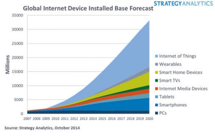 Forecasts for device sales over the next 5 years show a stunning rise in the sale of new types of Internet-connected devices: wearables, smart TVs, thermostats, refrigerators, and more. This environment has given raise to the phrase "The Internet of Things."