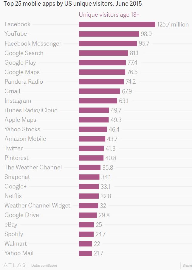 It's not 100% clear how the new economic models will work in this new world. In a smartphone environment, where we still have some screen real estate, the number of ads that can be shown are greatly reduced. There are many that believe that success in this environment will depend on personalization. For this reason, major advantages come to those who have people actively using apps (where those people stay logged in by default), as they can continuously collect information about you. For reference, here are the most popular apps in 2015 accoring to comScore: