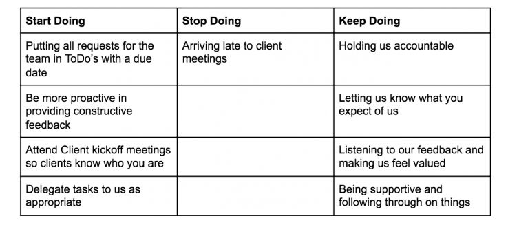 Step 2: The team writes the behaviors they want you to start doing, stop doing, and keep doing. They do this together on a whiteboard or digitally with one person as a scribe.