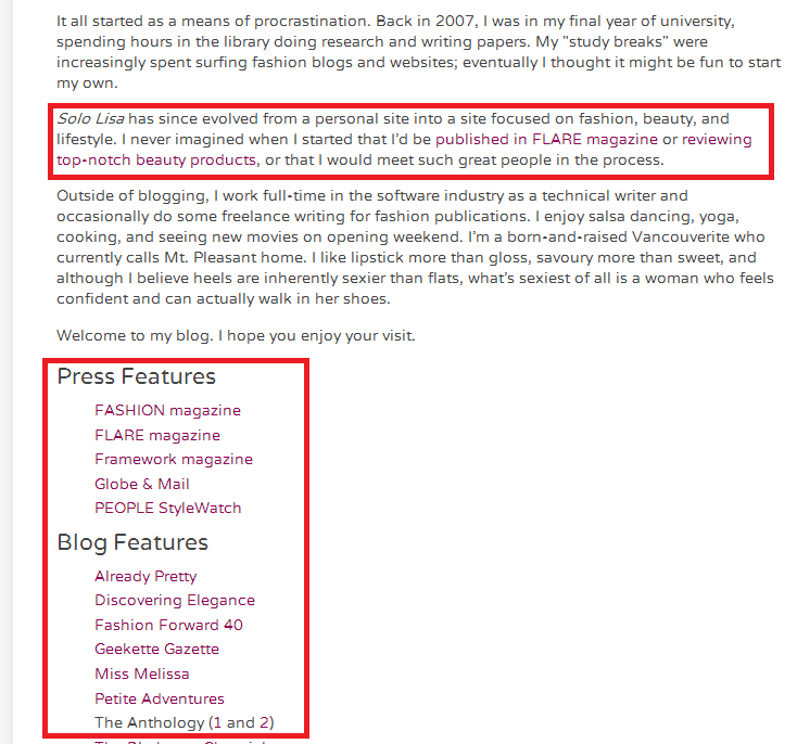 Lisa's About Me page shows at the top what her passions are, including reviewing beauty products. Below that, she also notes her influence via Press and Blog Features where you can get a better understanding that she enjoys fashion and beauty topics.