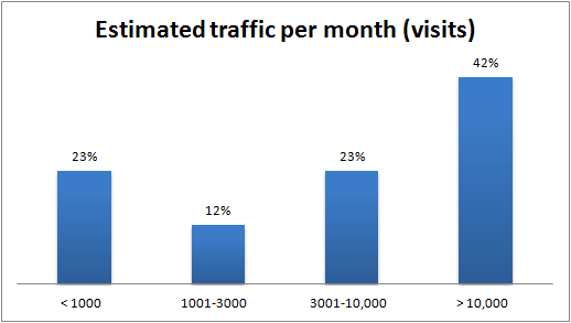 58% of our sample group is getting less than 10,000 visits per month, and 42% are considerably more popular, receiving more than 10,000 visits per month.