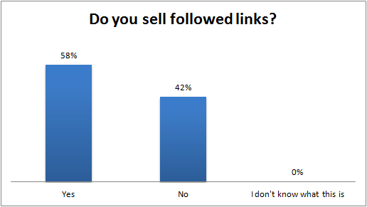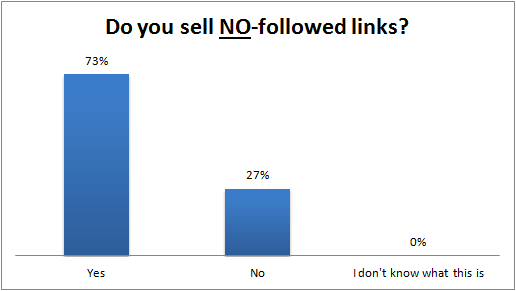 On the other hand, 73% said they also sold NO-followed links on their blogs. Both questions regarding followed and nofollowed links had an "I don't know what this is" option, but we were fortunate to have an educated sample, as no one used this response.