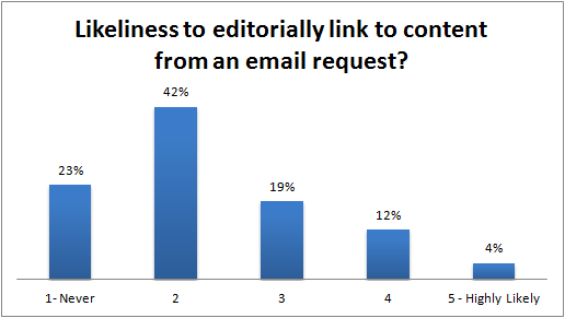 On a scale from 1 to 5, 1 being never, and 5 being highly likely, it seems as if our group was not very likely to editorially link to content that has been requested via email (by "editorially link" I mean create unpaid links).