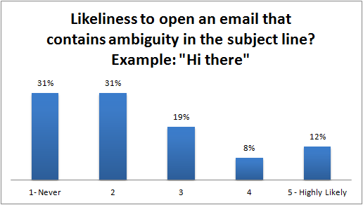 Ambiguity in the outreach email (example: "hi there") seems to be less favourable, with 62% of bloggers choosing 1 & 2 as their responses, with 1 meaning "never" and 5 meaning they were "highly likely" to open the emails.