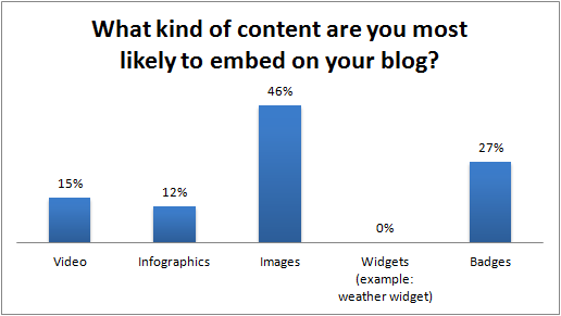 In descending order of preference, these bloggers were most likely to embed images, badges, videos, and infographics. None were willing to embed widgets (description of a widget was a weather widget).