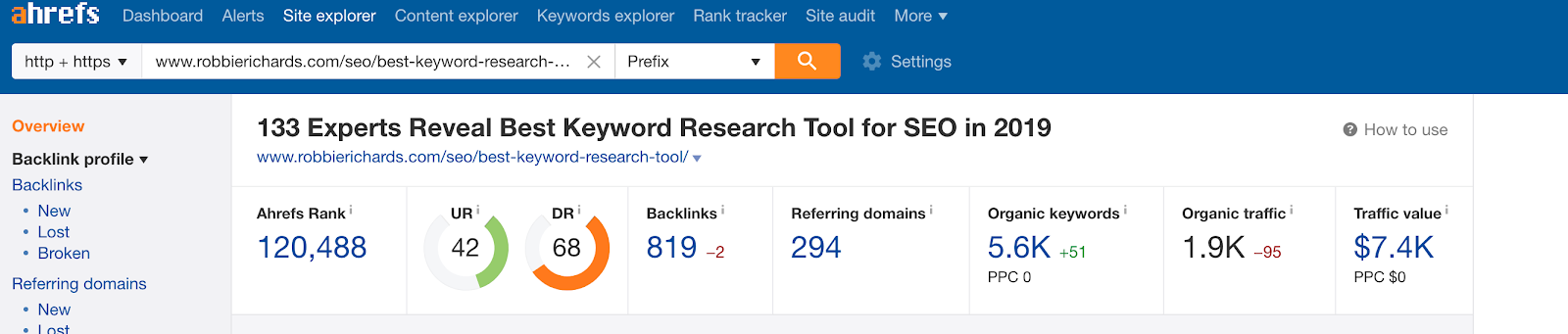 Robbie’s roundups are a textbook definition of highly linkable content. A post about the best keyword research tools published not that long ago on his blog attracted nearly 300 referring domains and a decent organic traffic share: