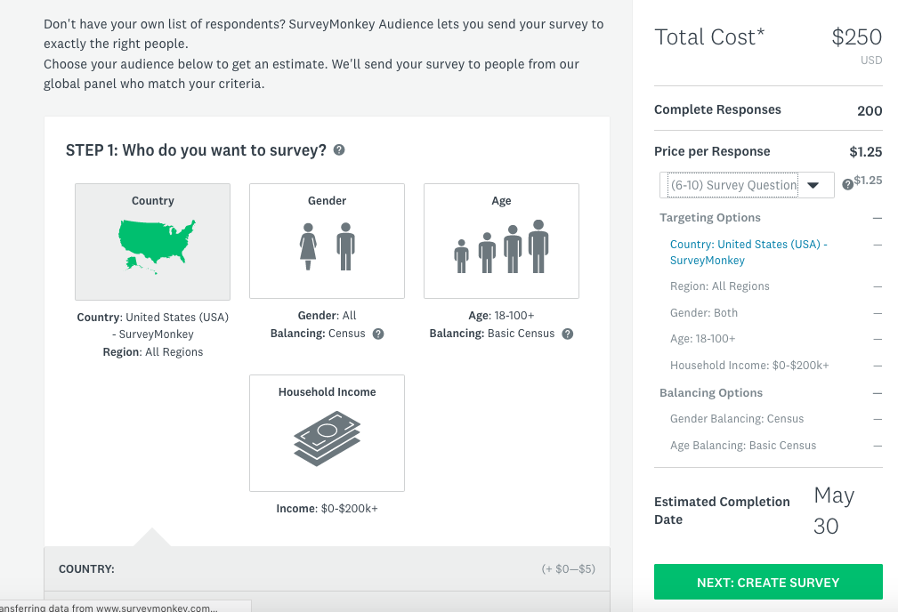 - Surveymonkey market research module starts from $1.25 for 200 complete responses. As you can see from a screenshot below, it allows you to set up a more laser-targeted group by selecting a particular industry.