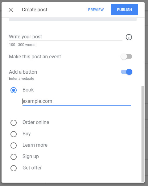 - Determine which of the options, labeled “Buttons,” is the right fit for your business. It could be “Book,” or it could be something else, like “Sign up” or “Buy.” Click the “Add a Button” option in the Google Posts wizard. Be sure the URL you enter includes a UTM parameter for tracking purposes.