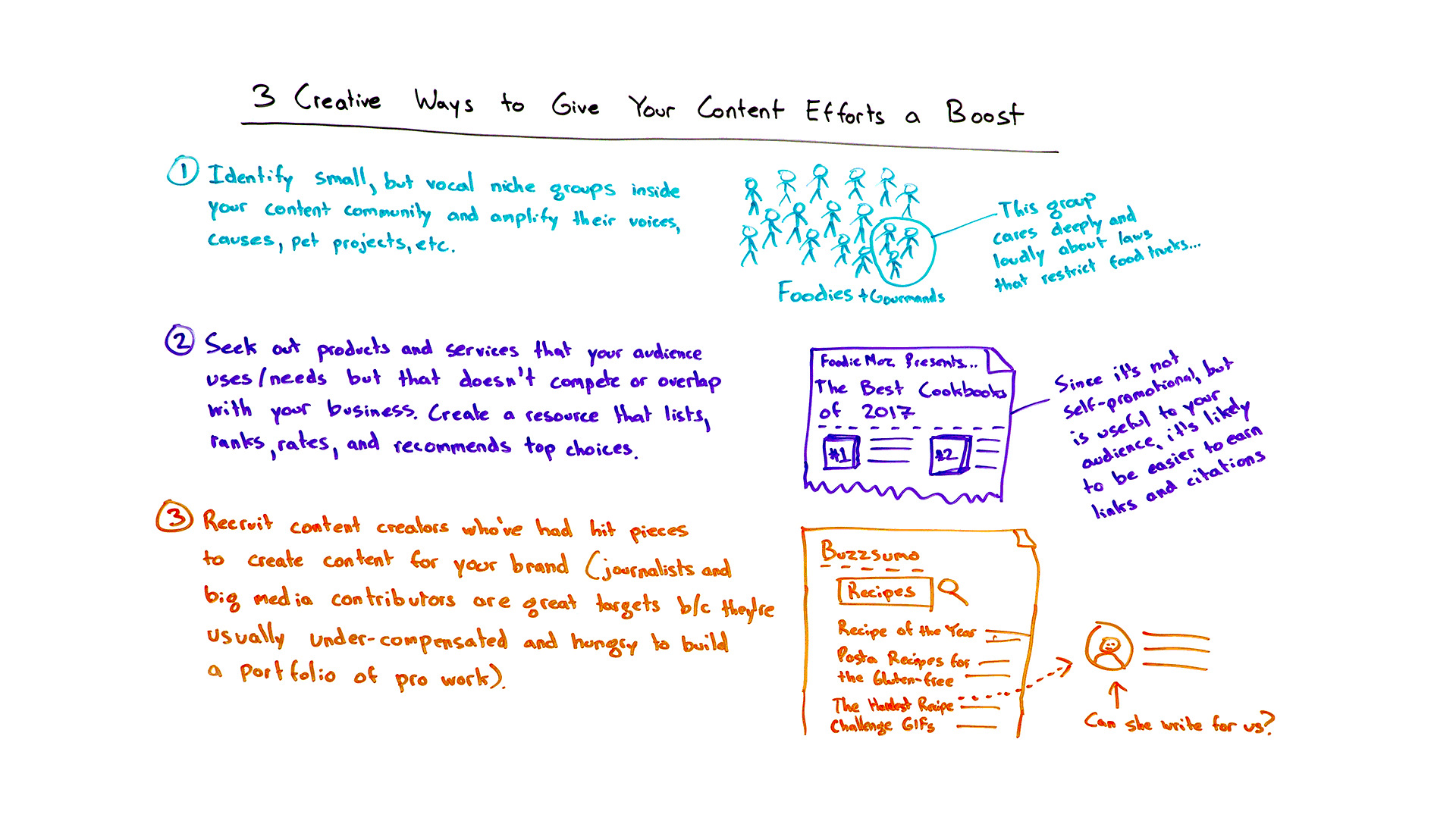 First one, if you can identify in your community these sort of small but vocal niche groups that are . . . when I say your community, it doesn't have to be people you already reach. It can be people inside the community of content generation and of topical interest around your subject matter. Then help them to amplify their voices or their causes or their pet projects, etc.