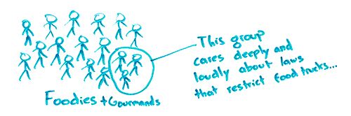 So I'll use the example of being in the foodie and gourmand world. So here's a bunch of foodies. But this particular tiny group is extremely passionate about food trucks, and, in particular, they really hate the laws that restrict food truck growth, that a lot of cities don't allow food trucks to be in certain spaces. They have to jump through a bunch of hoops to get licensed. They are not permitted to be permanently in a place for a whole week. Whatever it is, whatever those legal restrictions are. So by serving this small group, you might think that content is way too niche.