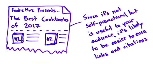 Since it's not self-promotional, but it is useful to your audience, the likelihood that you can earn links and amplification because you seem like a non-self-interested party is much greater. You're providing value without asking anything in return. It's not like anyone buying these cookbooks would help you. It's not like you have some ulterior motive in ranking this one number one or that one number two. You're merely putting together an unbiased set of resources that help your audience. That is a great way to get a piece of content to do well.