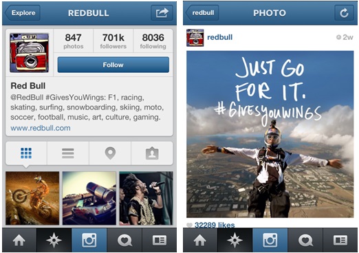 Red Bull’s (http://instagram.com/redbull) Instagram following has grown to over 701,000. The energy drink company posts exciting, high-energy photos depicting various adventures and stunts. These photos support the brand’s tagline, “Red Bull Gives You Wings.”