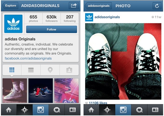 The adidas Originals (http://instagram.com/adidasoriginals) Instagram account has over 630,000 followers. This account differs from the adidas company account because it showcases photos of new merchandise alongside photos of the various ways that Adidas customers use their merchandise, like mismatched adidas shoes, wearing them out, or celebrities who support the brand. These photos make this specific account more exciting than the adidas company account, which posts many general and commercial-looking photos of their products, yet this account still has 237,000+ followers.