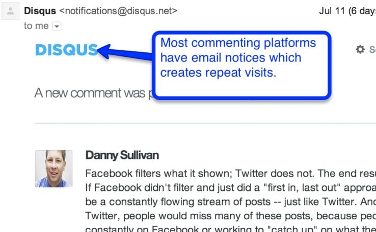 - As mentioned before, many comment systems like Disqus will send email notifications, which brings traffic back to your site.