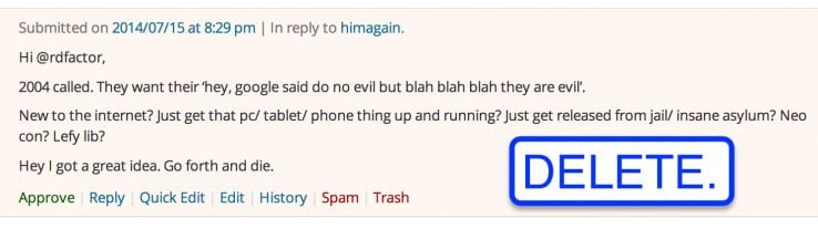 Here's an example of a comment on my blog, in reply to someone else. It's not very friendly, so it goes in the trash!