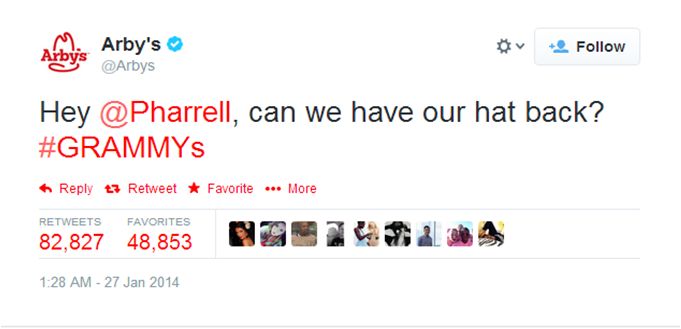 When Pharrell turned up to the GRAMMYs wearing *that hat* here's how @Arbys responded: