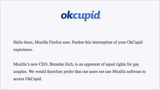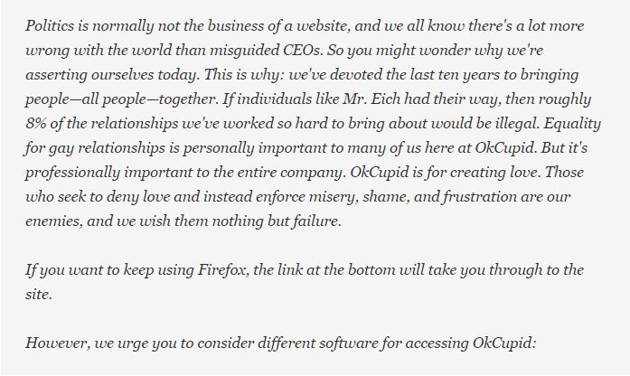 I think that taking the decision to stand for something is perhaps most potent when it could actually cost a brand customers. When Mozilla appointed a new CEO, OKCupid showed this message to Firefox users: