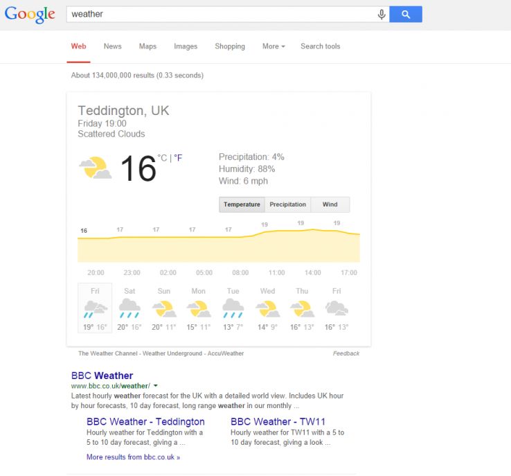 The BBC still rank first organically for 'weather'—but their listing is pushed beneath the fold. Plus, given the that the information the searcher is seeking is displayed right there in the SERP, I'm guessing they're not receiving as much traffic from this term as they once were.