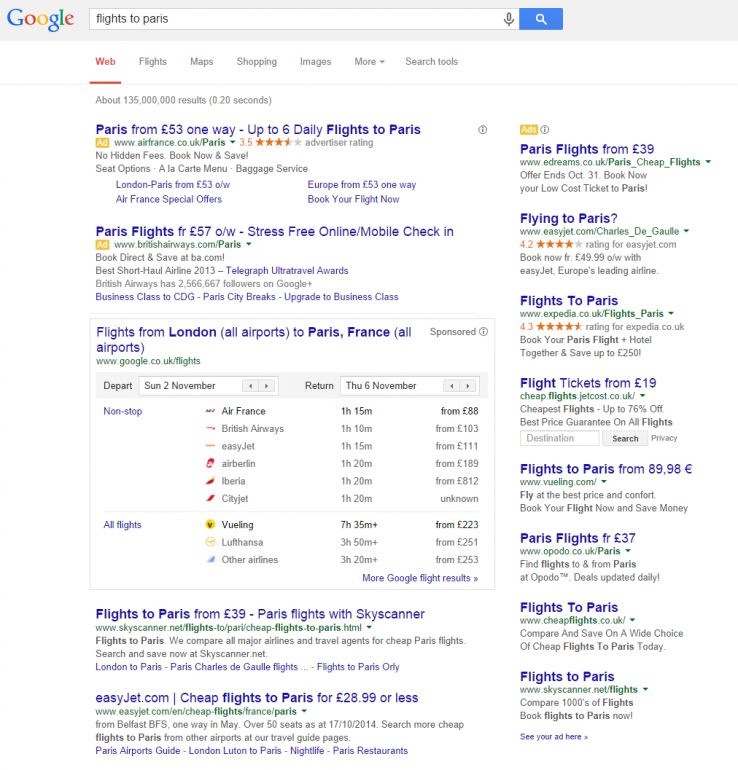 Skyscanner still rank first for the term 'flights to paris', but again here their organic listing is pushed beneath the fold thanks to paid search listings and the proprietary Google flight product.