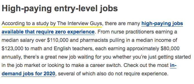 Let’s look at a study we did for The Interview Guys, as an example, which involved analyzing the U.S. Bureau of Labor Statistics’ Occupational Requirements Survey to identify the highest-paying jobs that require the least amount of experience. Here’s one of the graphics from the report: