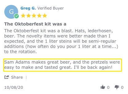 This isn’t purely a content strategy, but you can see the overlap between product and building more of an experience. People who love and count on Auntie Anne’s pretzels are exposed to Samuel Adams and vice versa. Through a collaboration like this, fans of one have the potential to become fans of the other, as you can see in this review: