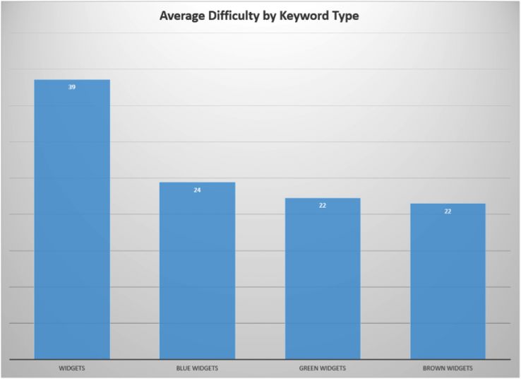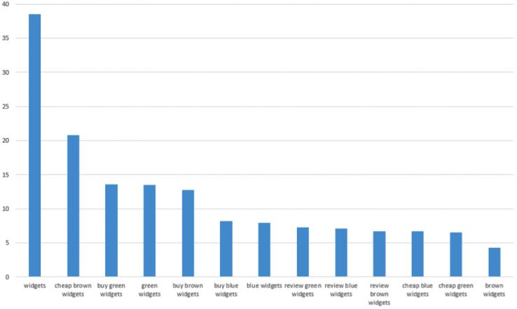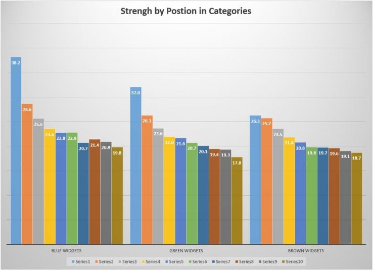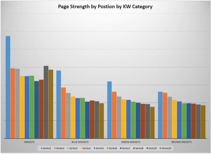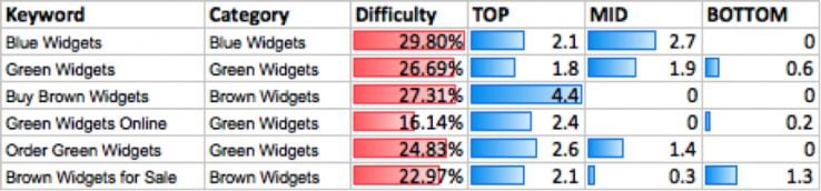 From this we can see that of the three keyword categories, we are likely to rank higher up for keywords in the "brown widgets" category. Having said that, though, we are also able to rank lower down the page in the "blue widgets" category, so if that has significantly more traffic it might prove a better investment of your time and energy.