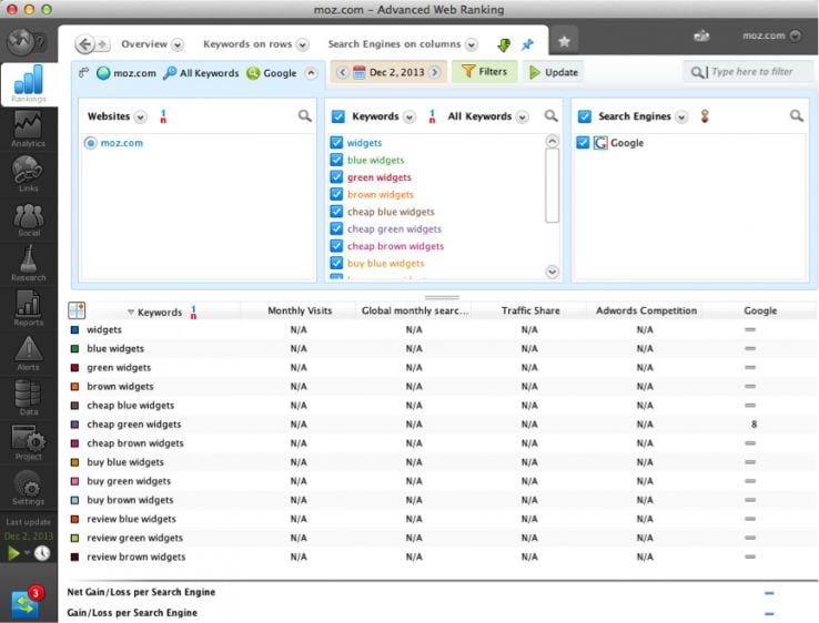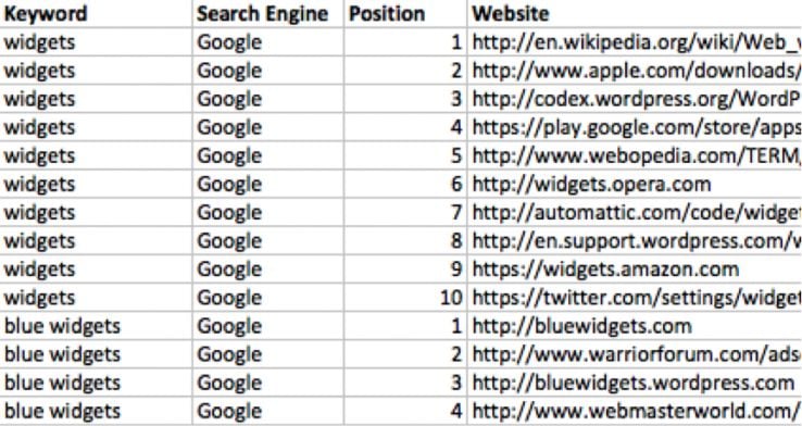 Once you have added your keyword set, run a ranking report of the top 10 results for the search engine of your choice. Once it's complete you should see a screen something like this: