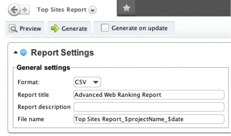 The next step is to get this data out of Advanced Web Ranking and into Excel, using a "Top Sites" report, in CSV format (The format is important! If you choose any other format it makes manipulating the data much tougher):