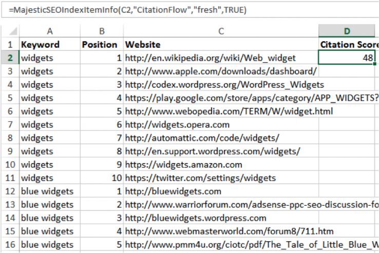 =MajesticSEOIndexItemInfo(C2,"CitationFlow","fresh",TRUE)