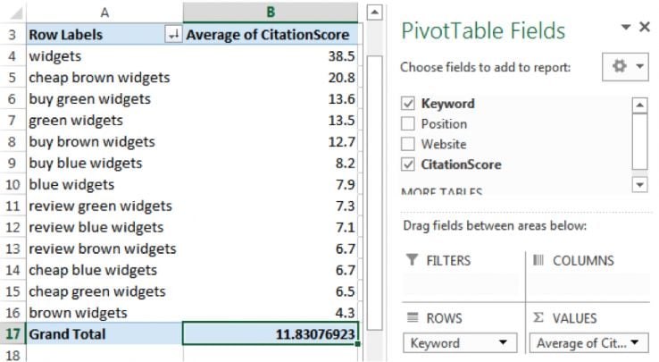 For a simple look, just create a pivot of the average citation score of each keyword, the resulting table creator wizard will look something like this: