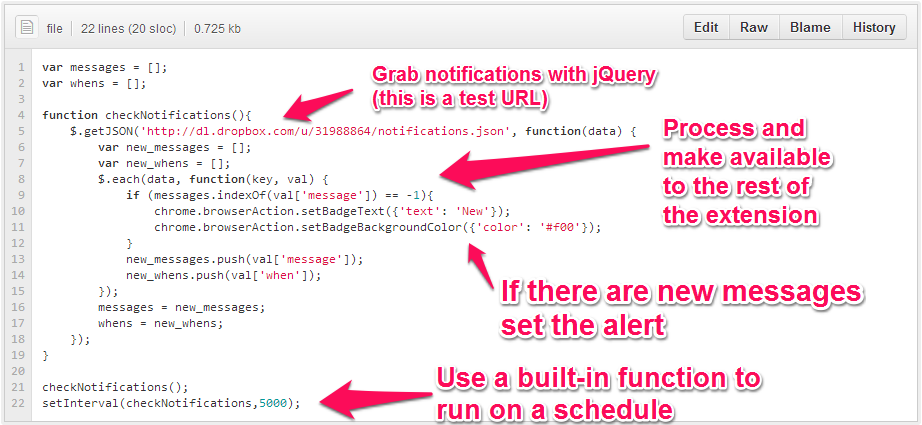 Let's start by looking at background.js - which runs permanently in the background fetching updates so that we can (a) display an alert when there are new notifications and (b) we don't have to wait for the notifications to load when we click on the icon. Background.js looks like this (click for larger version):