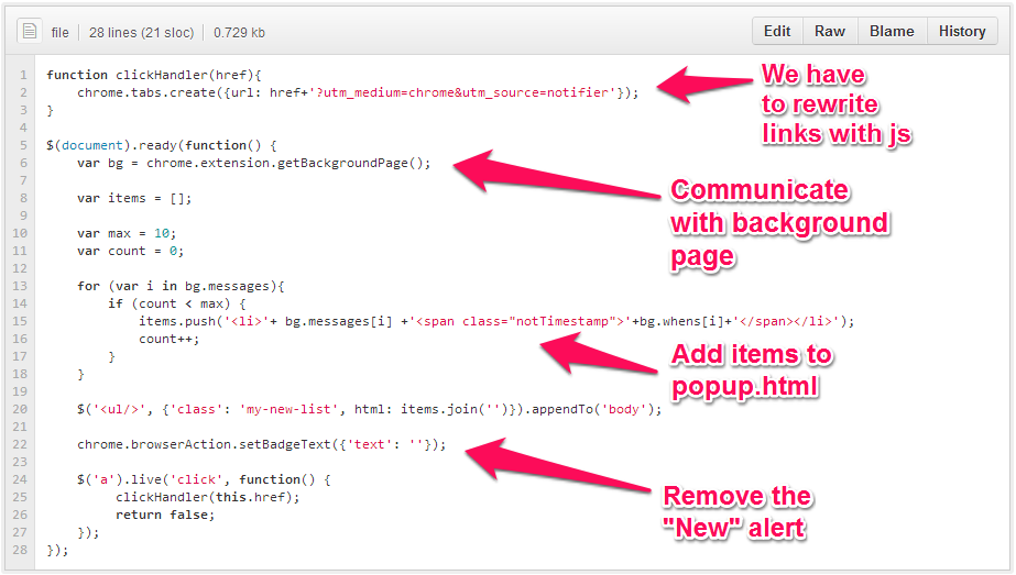 The observant among you will notice that there is essentially no content in here - it's added by jQuery in popup.js (click for full size version):