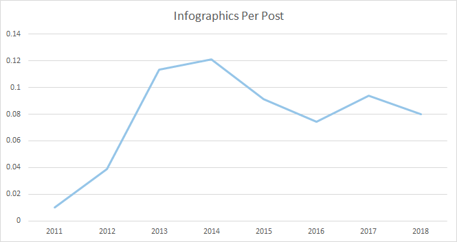 In fact, when pitting infographics against all of the other content types (comparing the total number of features), apart from 2013 and 2014 when infographics wiped the floor with everything, there’s no signal to suggest that we need to ditch them: