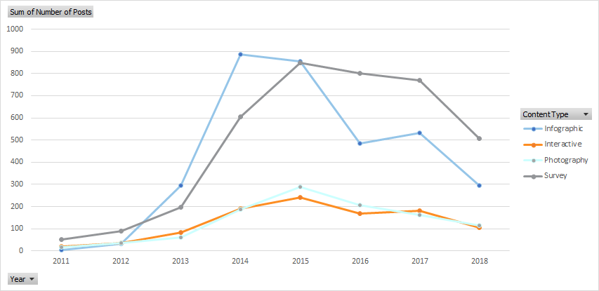Again, using figures publisher-side, we can see that the number of posts that feature infographics is consistently higher than the number of features for interactives and photographic content. Surveys have more recently taken the mantle, but all content types have taken a dip since 2015. However, there’s no clear signal there that we should be moving away from infographics just yet.