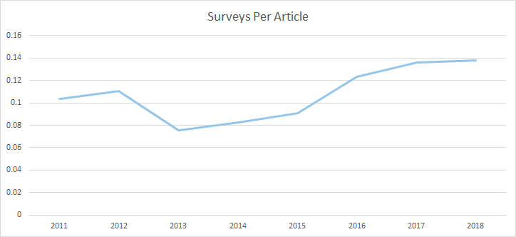 When I cross-reference to find the number of surveys being used per article, we can see that in every year since 2013 their usage has been increasingly steadily. In 2018, they're being used more often per article than infographics were, even in their prime: