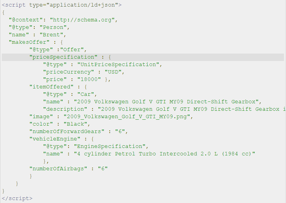 You’ll want to start by using the Vehicle “Type” schema and then markup each particular car using the Auto schema markup JSON-LD code. You can find the Schema.org guidelines for using Schema Markup for Cars on Schema.org. Below is an example of what JSON-LD schema markup looks like for a 2009 Volkswagen Golf: