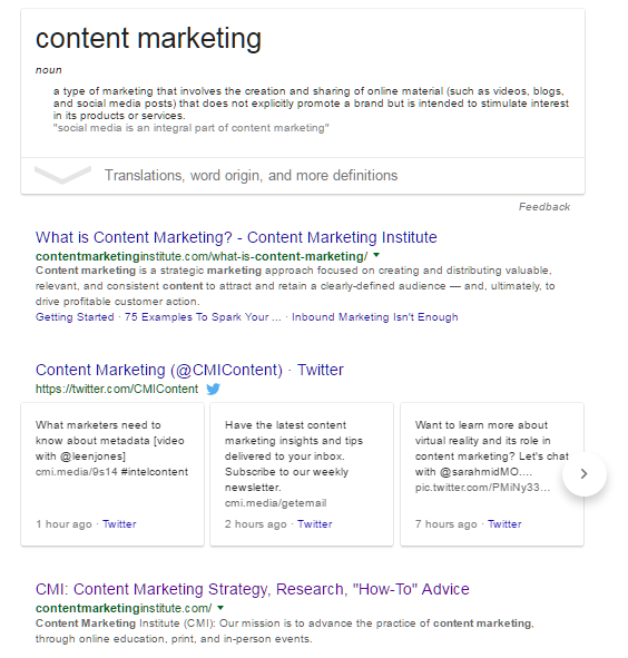 Some SERPs are incredibly competitive. For instance, if you’re trying to rank for "content marketing," you’ll find that the first page is dominated by CMI (DA 84):